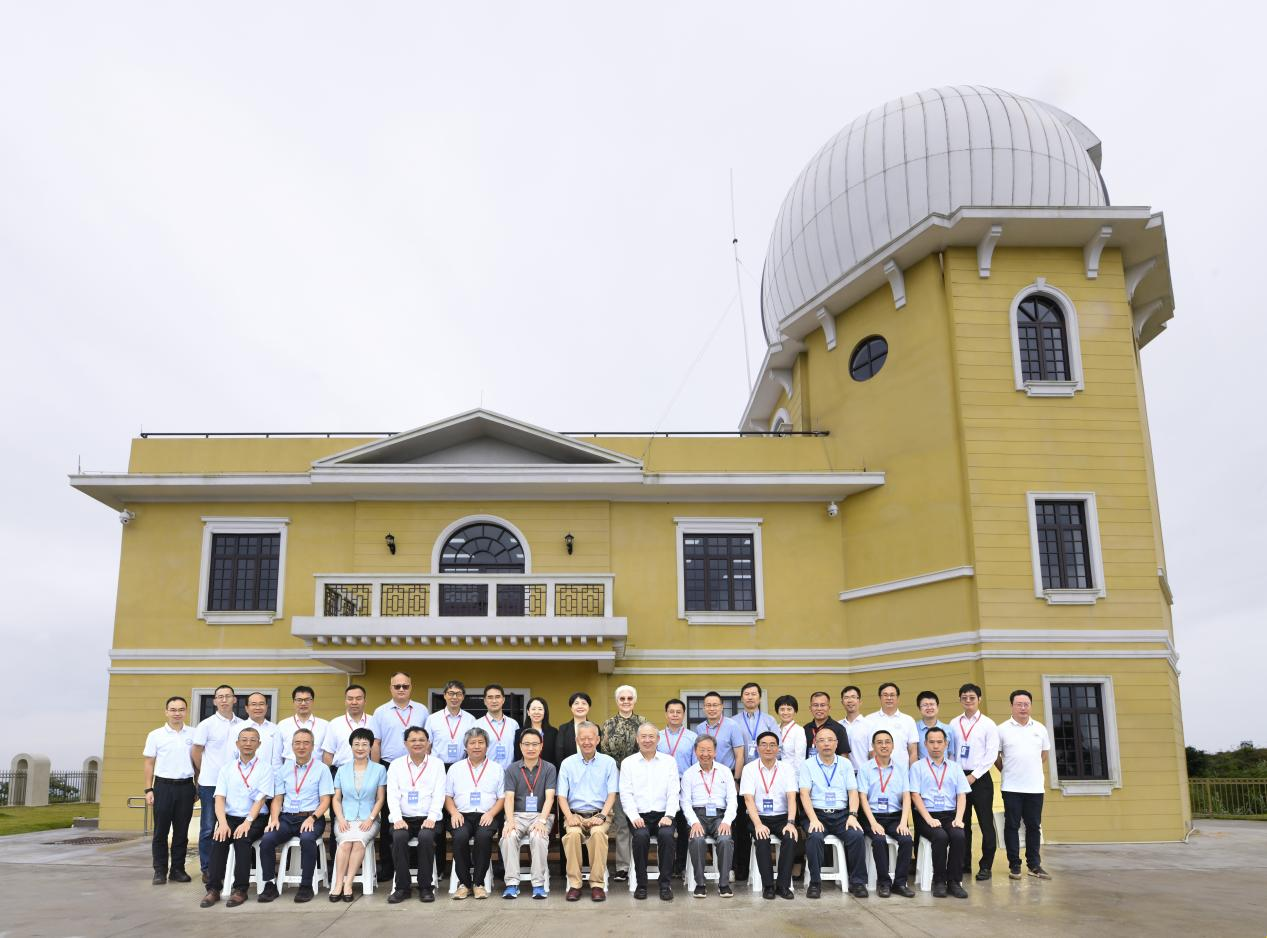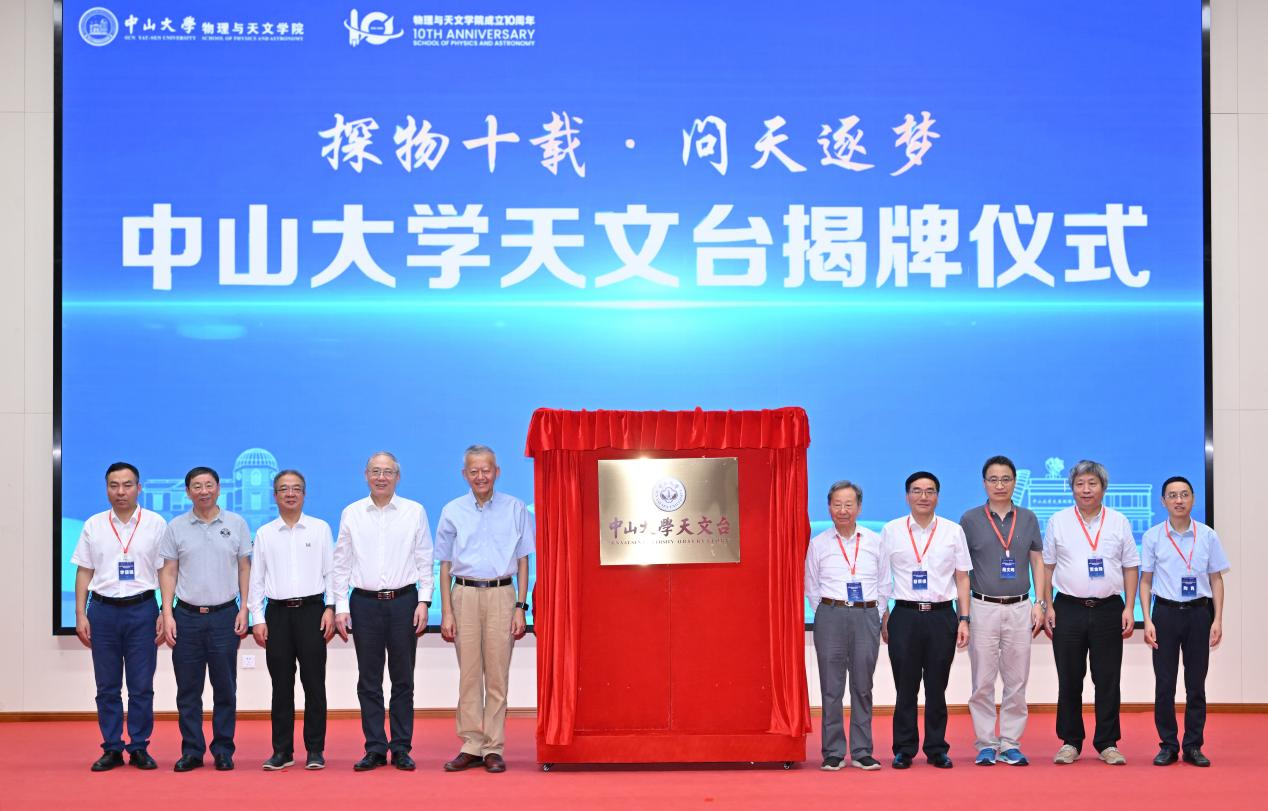 会上,学院隆重举行了中山大学天文台揭牌仪式。陈春声教授、罗俊院士、杨清华常务副校长、叶朝辉院士、张培震院士、蔡荣根院士、段文晖院士、贾金锋院士、陶隽书记和李语强副台长为中山大学天文台揭牌。从1927年创办国内首个天文学系,到如今位于凤凰山顶的中山大学天文台的落成,中山大学天文学科历经百年弦歌不辍。中山大学天文台将肩负起人才培养与科学研究的双重使命,继续传承中大天文精神,以前辈们为榜样,力争再现昔日荣光,引领师生在探索宇宙奥秘的道路上不断前行。