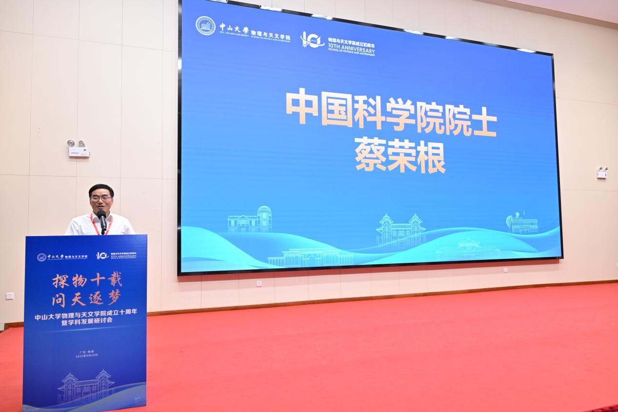 蔡荣根院士向中山大学物理与天文学院全体师生致以热烈祝贺。他回顾了学院在人才培养、科学研究方面取得的成就,并希望物理与天文学科作为前沿学科,承载着国家科技创新的重任,期待学院在新的起点上继续坚持立德树人根本任务,持续深化交叉融合的学科建设,勇攀科研高峰。